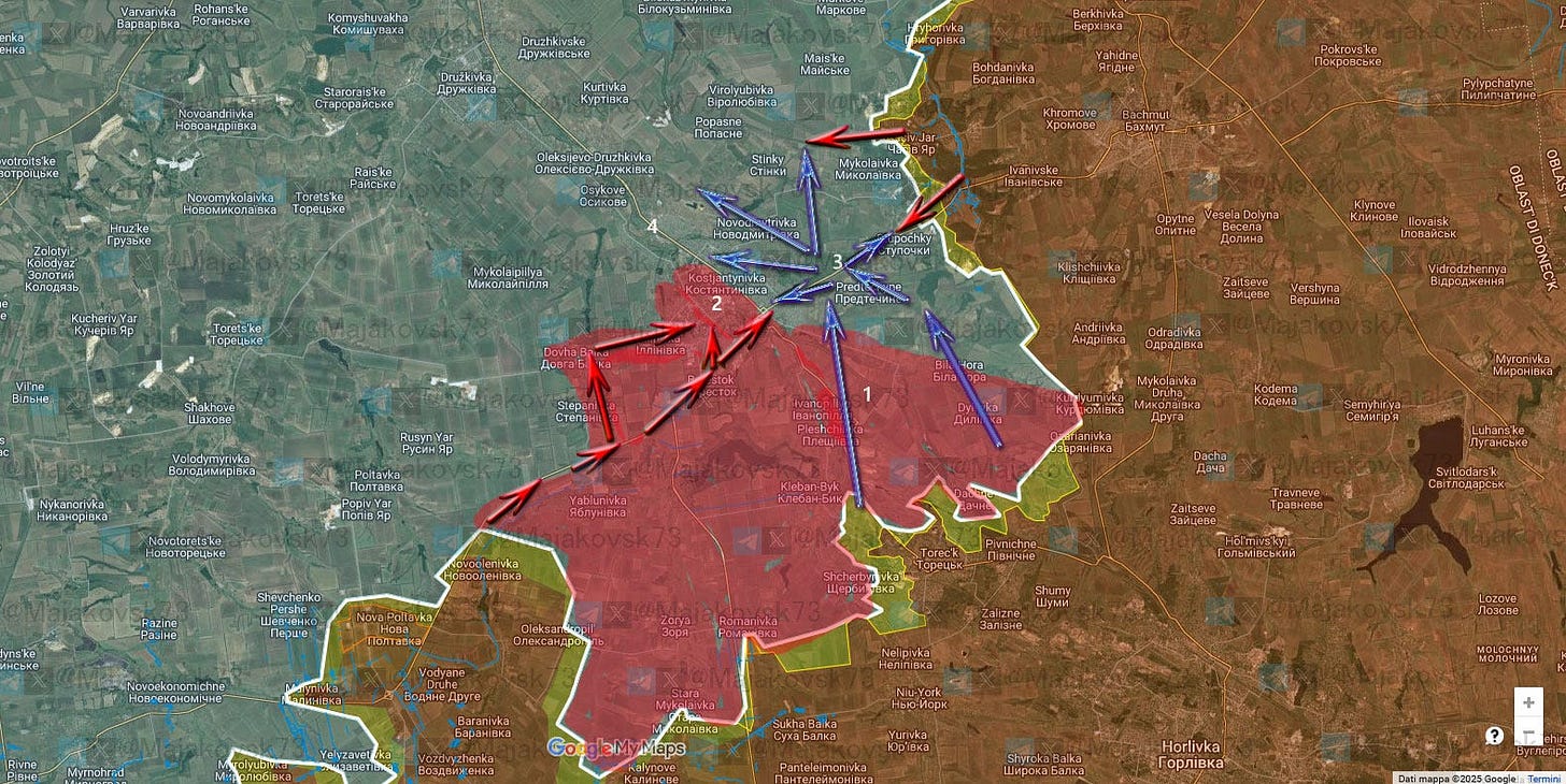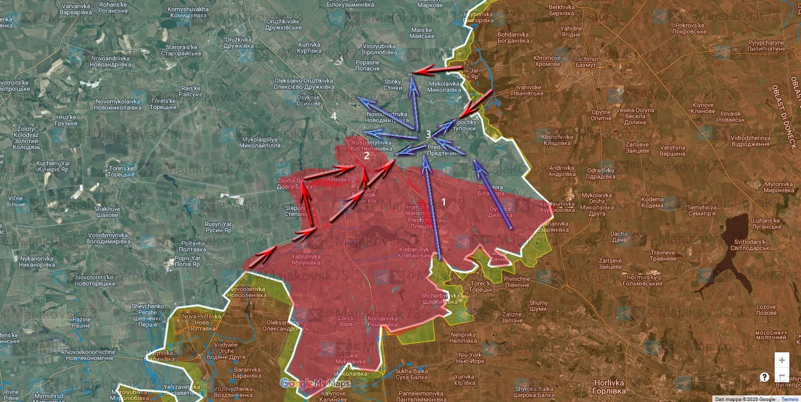 Osservando l'immagine aggiornata del fronte, si nota chiaramente come i russi abbiano avanzato sul fianco di Toretsk, proseguendo un movimento perfettamente coerente con quanto indicato nell’immagine di maggio.