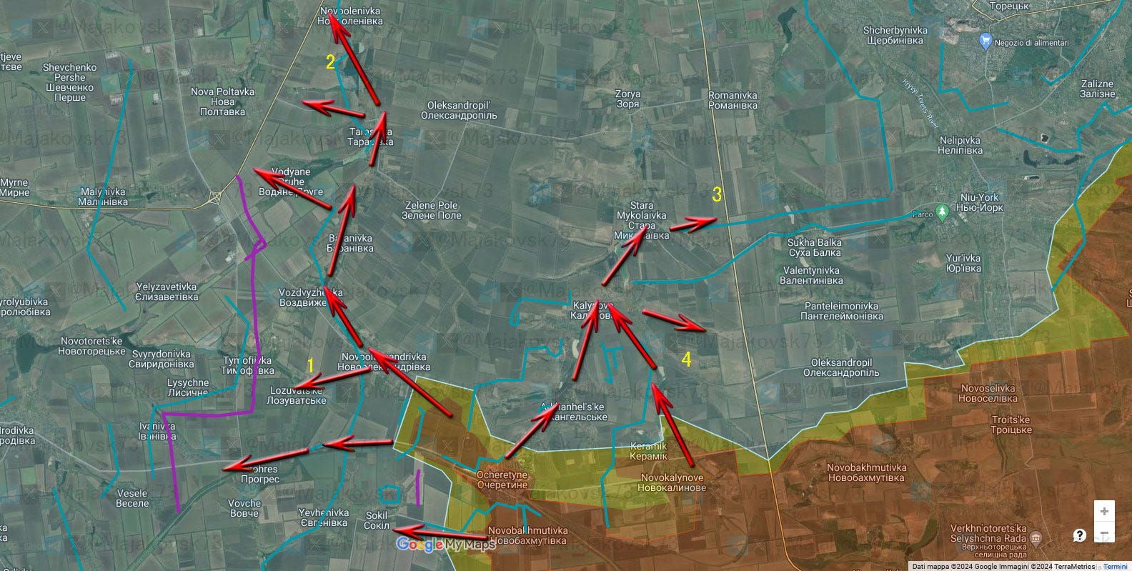 Invece per ora i russi hanno attaccato la parte di Keramik (4), che permette più o meno lo stesso percorso, sfruttando lo stesso vantaggio altimetrico, per arrivare a Kalynove
