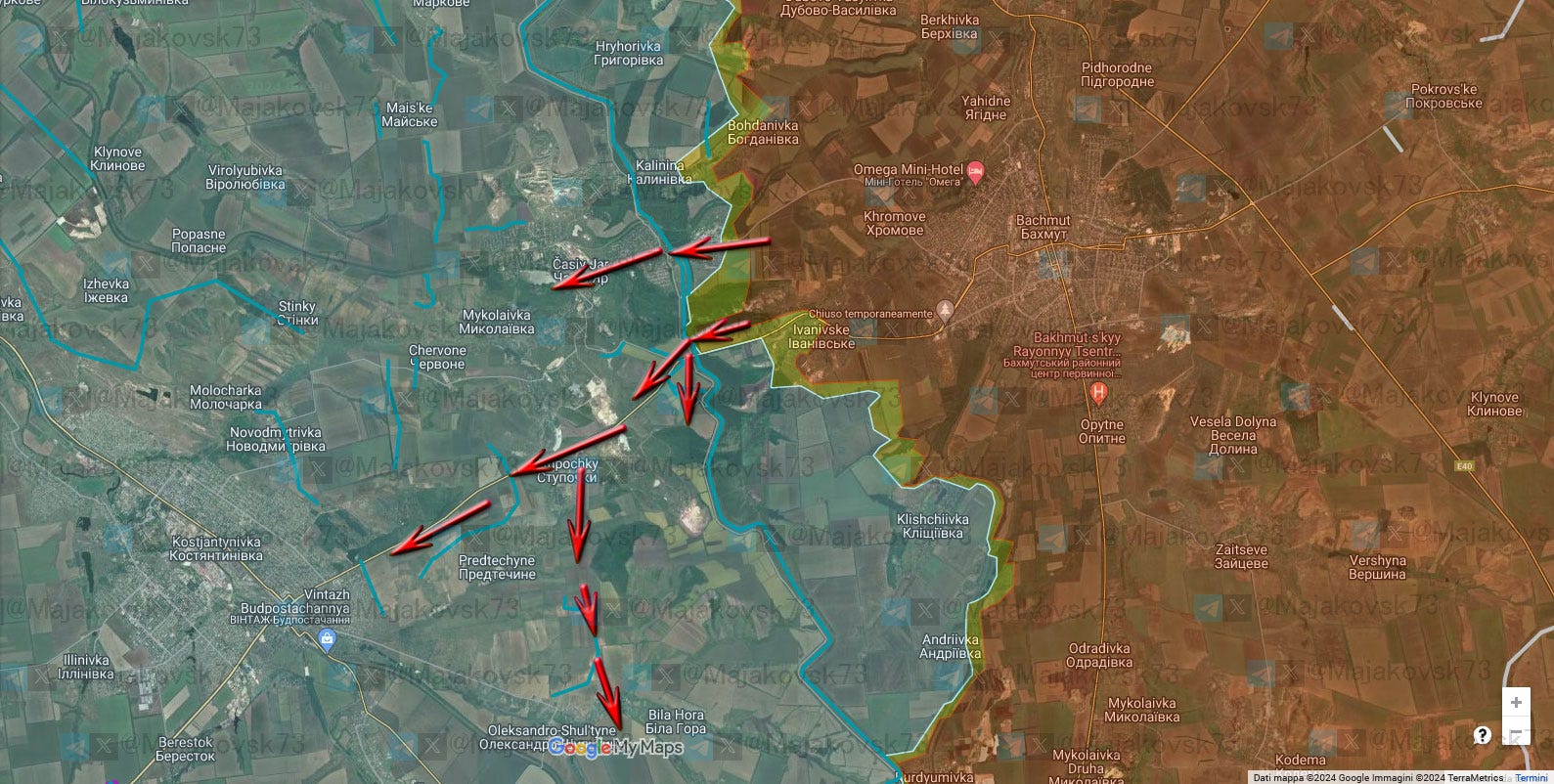 Strada per i russi qui mi sembra obbligata, dando per scontato conquista della parte bassa di Chasiv Jar, oltre il canale, per il resto dovranno, dalla parte di Chasiv o dalla parte di Stupochky, salire le colline. Ipotizzando un successo nell’offensiva e che i russi riescano a salire sulle colline, la situazione tattica potrebbe essere questa